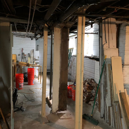 Balloon construction over time without adequate foundation reinforcement meant that the old gal was sinking in the middle. We added xx new lally columns and xxx beams to stop the descent. It was too risky to all the original woodwork and glass to try to raise the floors to be level.